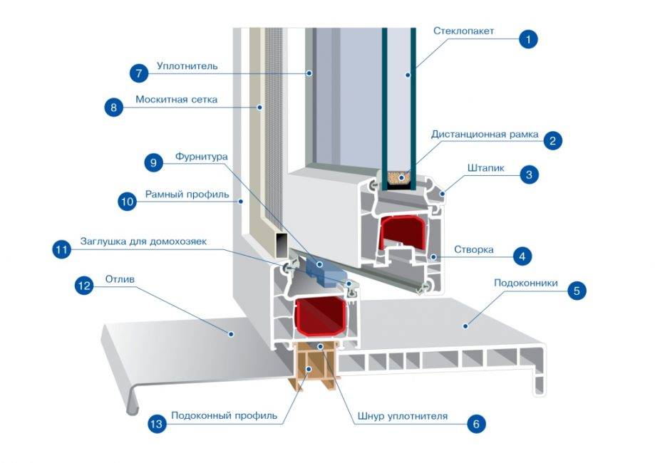 Несмотря на разнообразие брендов, каждый из которых описывает товар по-своему, система окна с профилем из ПВХ состоит из одинаковых компонентов. Внешне конструкция выглядит просто: пластиковый каркас, прозрачные окна, аккуратные ручки.