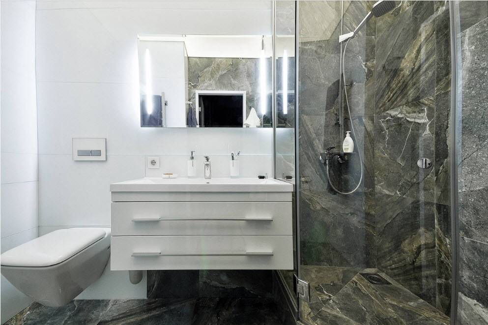 Душевую также лучше отделать в тон самой ванной комнате, в том случае если дизайн не предполагает обратного. Тем более, если стенки кабины будут выполнены из прозрачных материалов, то душевая станет продолжением комнаты, будет казаться прозрачной, создавая эффект отсутствия, при том, что пол там будет выполнен вровень со всем помещением.