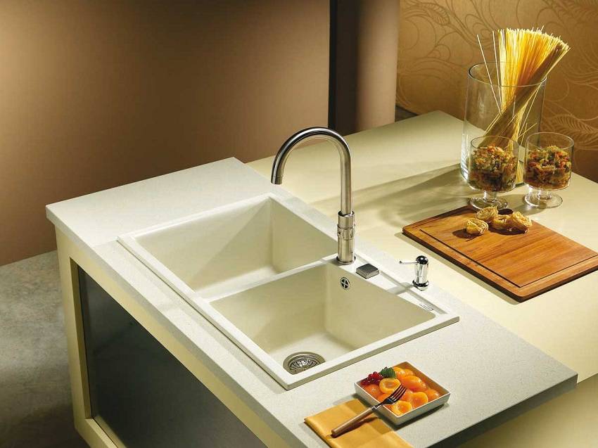поглощение звука. Мойки из нержавейки при падении на них капель воды издают громкий раздражающий звук, и даже выдумки производителей со слоем звукоизоляции под раковиной не спасают. С каменным изделием таких проблем не возникнет – вода будет падать бесшумно;