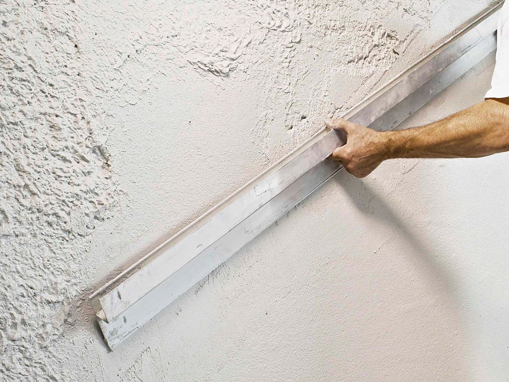Приступая к этому этапу, поверхность должна просохнуть. Затем оценивается ее состояние при помощи правила, там, где есть впадины, ставятся отметки. Дальнейшая работа производится не очень густым составом.