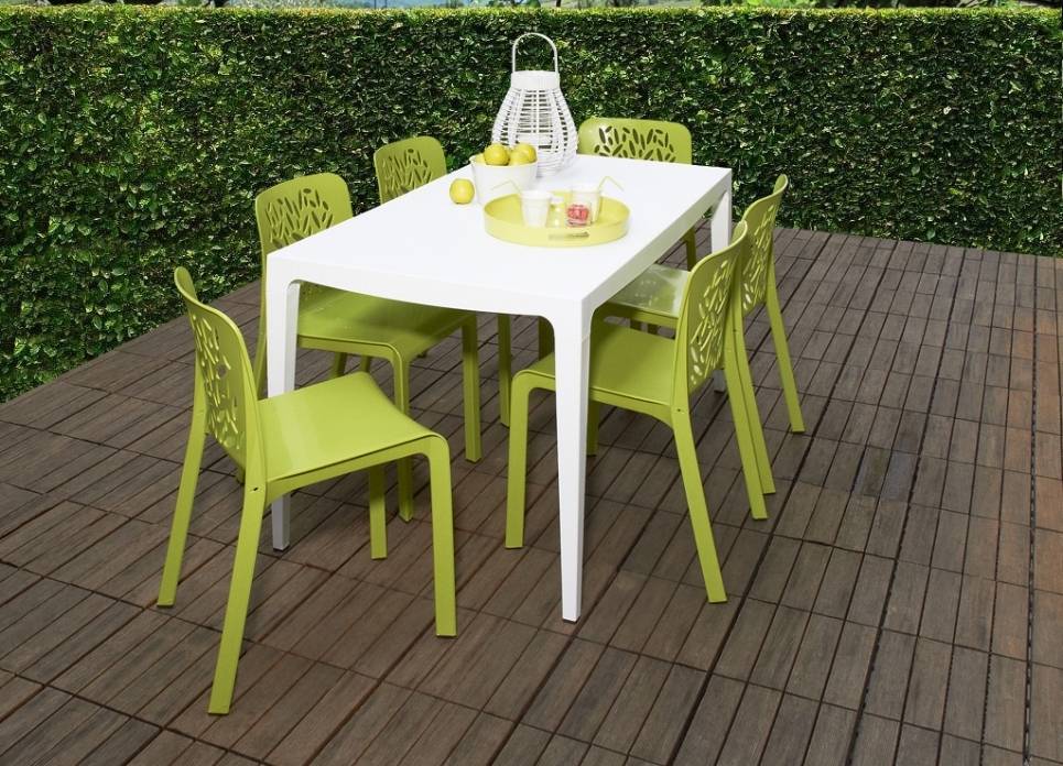 Пластиковая мебель, хотя весьма практична в саду, здесь выглядит неэстетично. Однако можно найти довольно оригинальные наборы пластиковой мебели, выглядящие современно, элегантно.