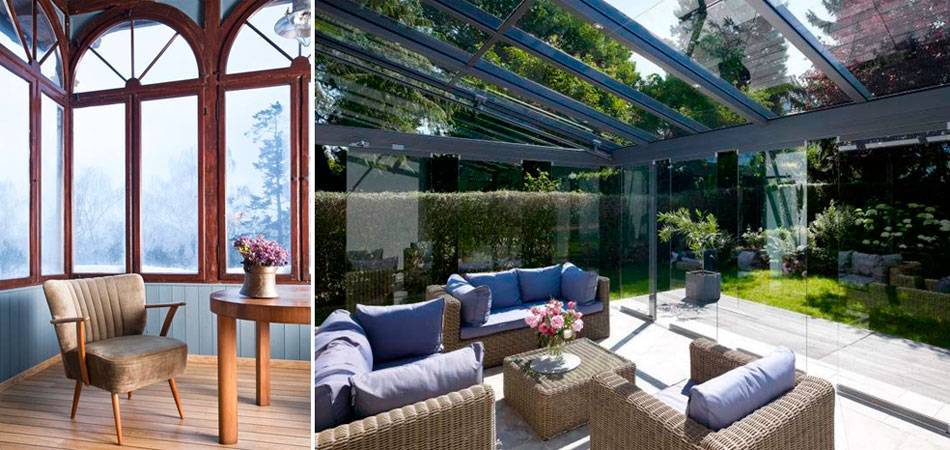 Существуют варианты со стеклянной крышей на алюминиевой конструкции, где боковые стенки заполнены огромными стеклами. Прекрасно освещенная обстановка дает ощущение гармонии с природой, комната насыщена солнечным светом.