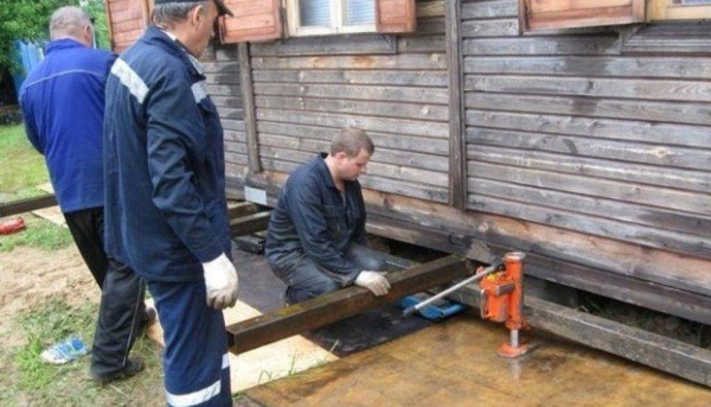 Затем под них снаружи подводят домкраты и приподнимают дом, разгружая фундамент.