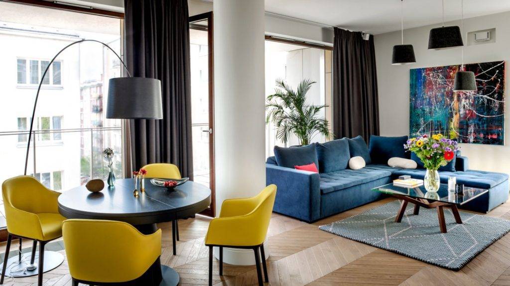 | Желто-голубые | Противоположны по своей природе цвета. Голубой освежит интерьер, желтый будет делать его теплее. |