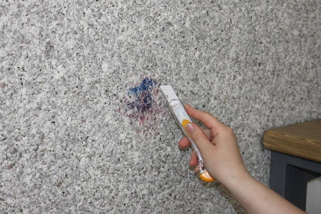 При всем том, что материал легко снимается и переклеивается, вряд ли кто-нибудь хранит по 10 лет запасные пакеты с жидкими обоями. А участок, запачканный собачьими-кошачьими метками со следами от грязных лап, необходимо будет заменить полностью.