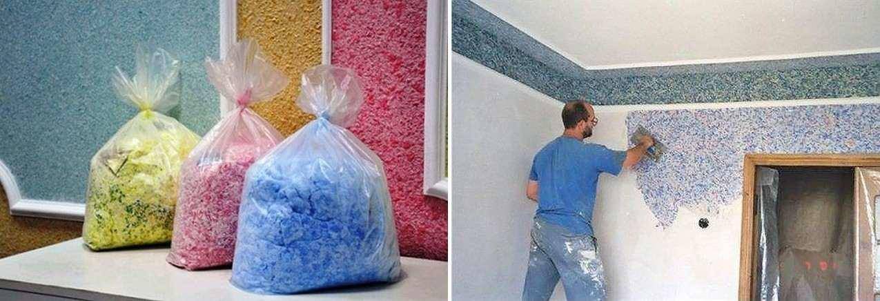 В структуре они содержат мелкие хлопья бумаги, а при нанесении на поверхность стен образуется влагостойкое и гладкое либо незначительно рельефное покрытие, абсолютно монолитное.