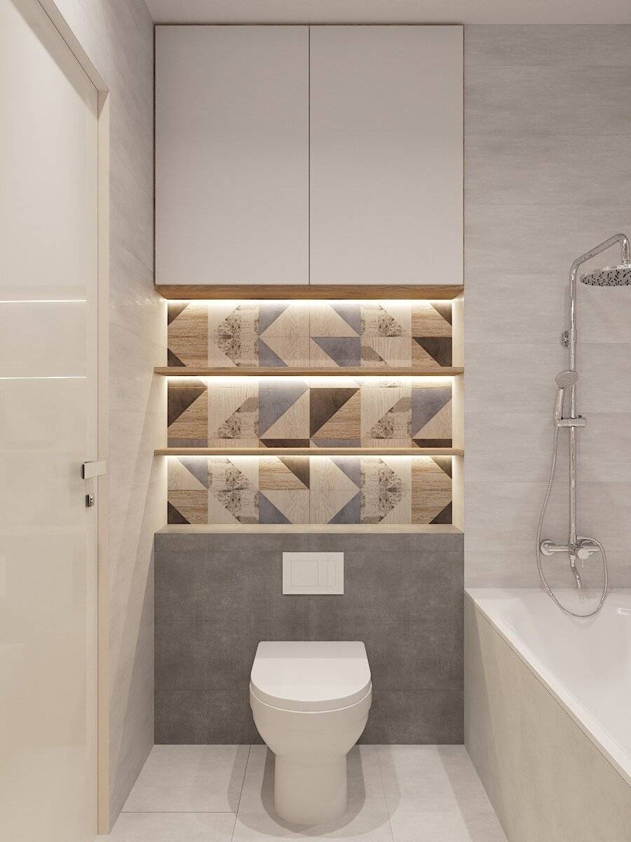 Также стоит ввести элемент типа фотообои или интересный узор (например, выложенный из плитки), который поможет выявить глубину и привнесет приятную атмосферу в туалет. Этот тип аранжировки можно наносить на всю стену или на ее части.