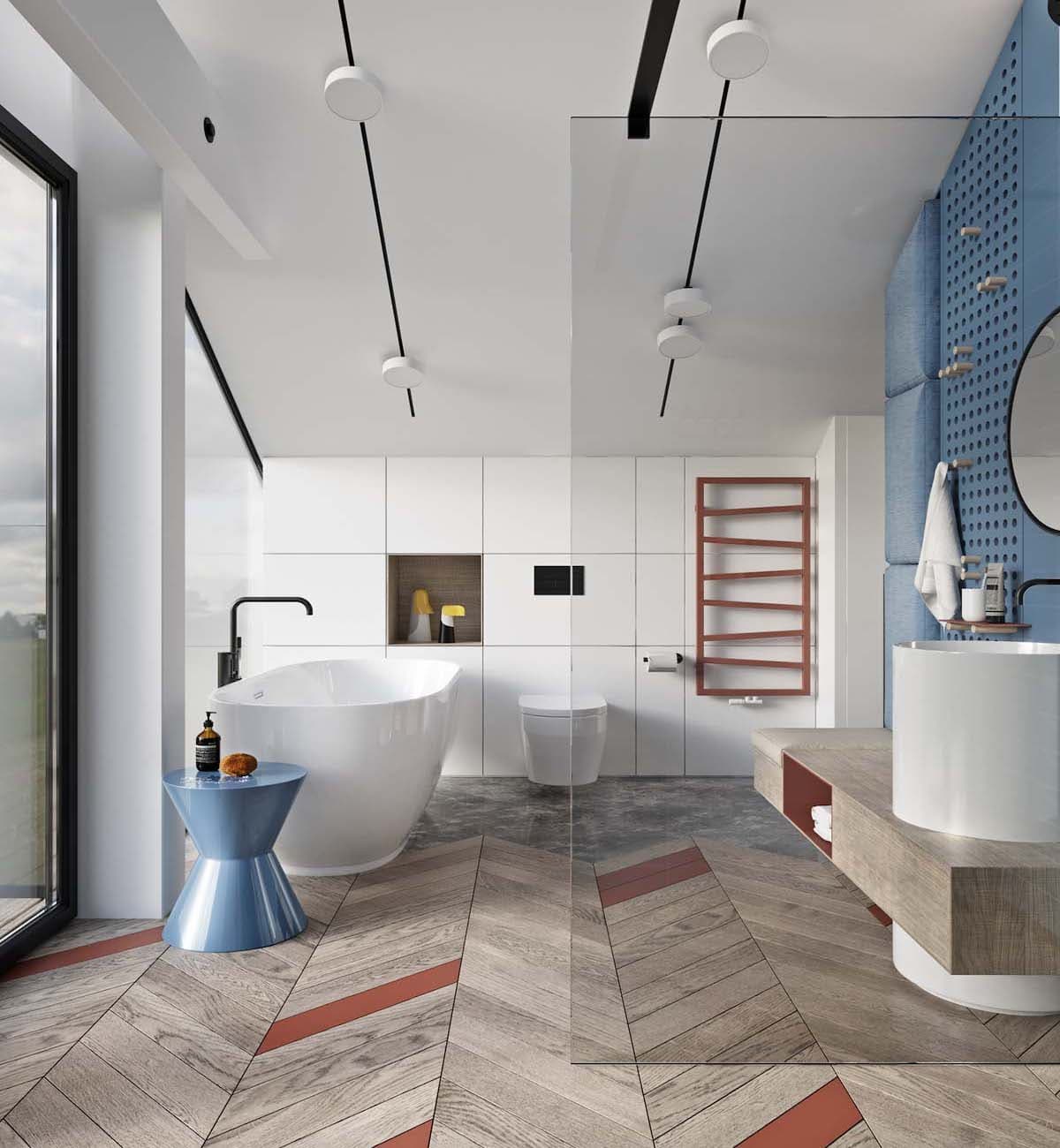 Простой рисунок и цвет будут прекрасно смотреться в ванной любого стиля