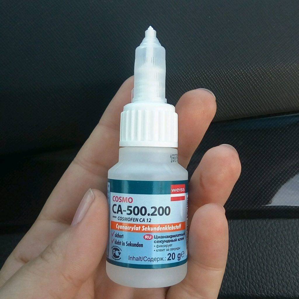 Cosmo — 500.200 (секундный цианакрилатный). Обладает мгновенной фиксацией. Подходит для работ с любыми популярными материалами. После нанесения получаются долговечные, стойкие к воздействию влаги швы, которые не боятся перепадов температуры и агрессивных химикатов.