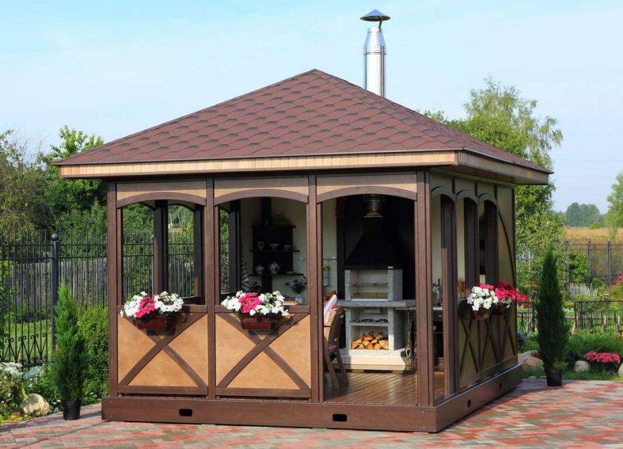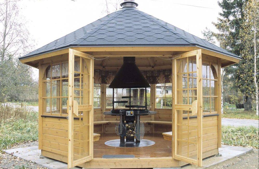 Садоводы иногда строят стационарную беседку из дерева, но тогда стоит помнить, что само место, где находится огонь, в любом случае сооружают из металла и камня, а деревянные части обрабатывают огнестойкой пропиткой в несколько слоев.